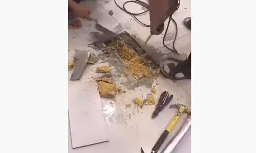 割れた洗面台を麺で補修する映像。